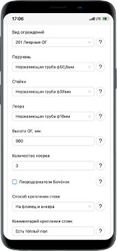 • Выбираете вид ограждений (шаблон, в котором учтены все нюансы) • Вносите длины лестничных маршей • Указываете количество стоек • Указываете способ крепления и прочие детали